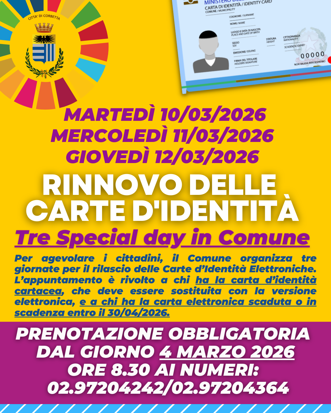 Martedì 10 Marzo pomeriggio, Mercoledì 11 Marzo mattino e Giovedì 12 Marzo mattino, si svolgeranno i Cie Day per il rinnovo delle carte identità cartacee, a prescindere dalla scadenza del documento, oltre a quelle elettroniche in scadenza entro il 30.04.2026.