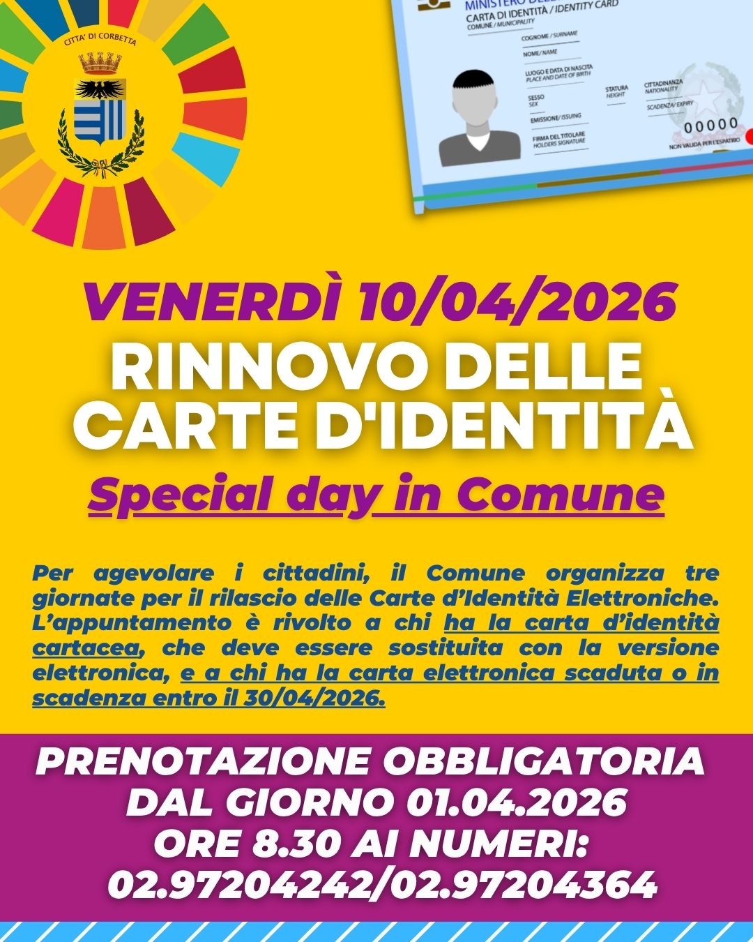 Nella giornata di venerdì 10 Aprile, si svolgerà il Cie Day per il rinnovo delle carta identità cartacee a prescindere dalla scadenza del documento, oltre che a quelle elettroniche in scadenza entro 30/04/2026.